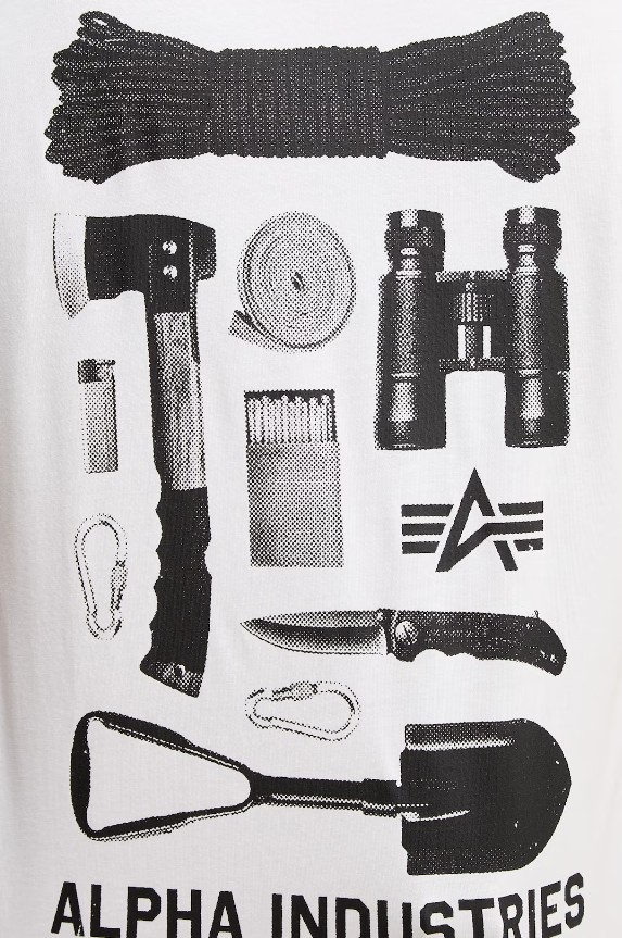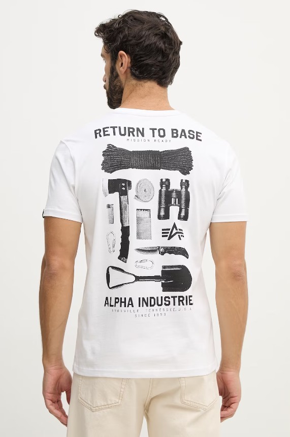Alpha Industries, Return To Base, t-shirt bawełniany, koszulka męska, t-shirt męski, koszulka z nadrukiem, streetwear, militaria, lotnictwo wojskowe, RTB, Regular Fit, bawełna 100%, Single Jersey, 170 g/m², nadruk na plecach, zestaw narzędzi, odzież casualowa, prezent dla pilota, amerykańskie siły powietrzne, odzież militarna, t-shirt streetwearowy, koszulka bawełniana męska, Alpha Industries Return To Base, t-shirt z historią, odzież z dziedzictwem.